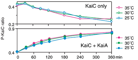 It was known that KaiC could phosphorylate itself, but that the rate was much higher in the presence of KaiA. Tomita then studied in vitro systems consisting of purified KaiC and KaiA or just KaiC, along with ATP (the source of phosphates), a buffer and salts. Initially about 0.4 of the phosphoryation sites on the purified KaiC were phosphorylated. For KaiC alone It was found that the level of phosphorylation increased slightly in the first 30 minutes, then decreased steadily for the remainder of a 6 hour period, and the rate of decrease was the similar at the three temperatures(top part of figure at right). When KaiA was also present, the phorphorylation increased steadily, reaching about 0.8, again at the about the same rate at the three temperatures.